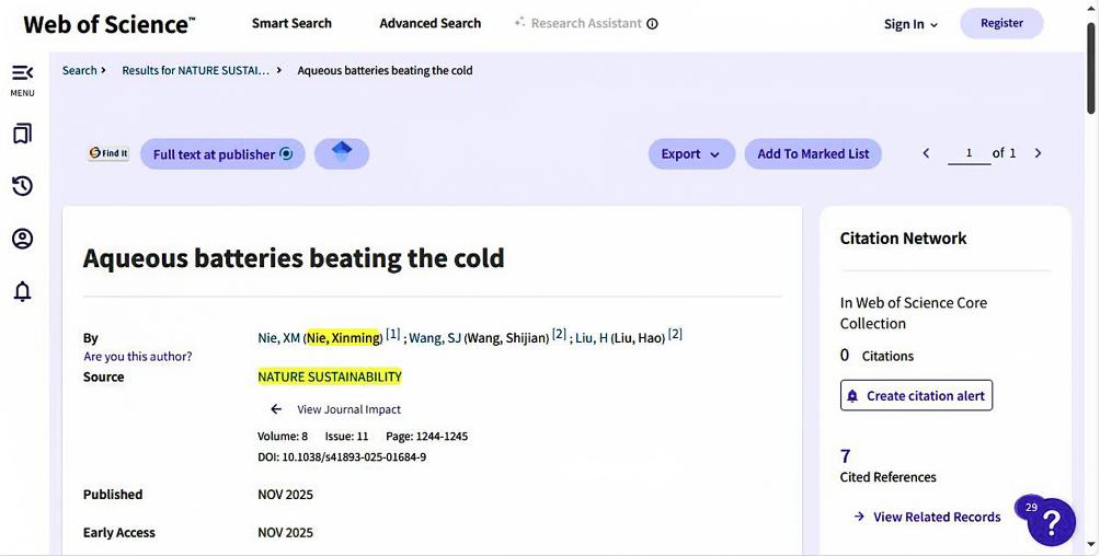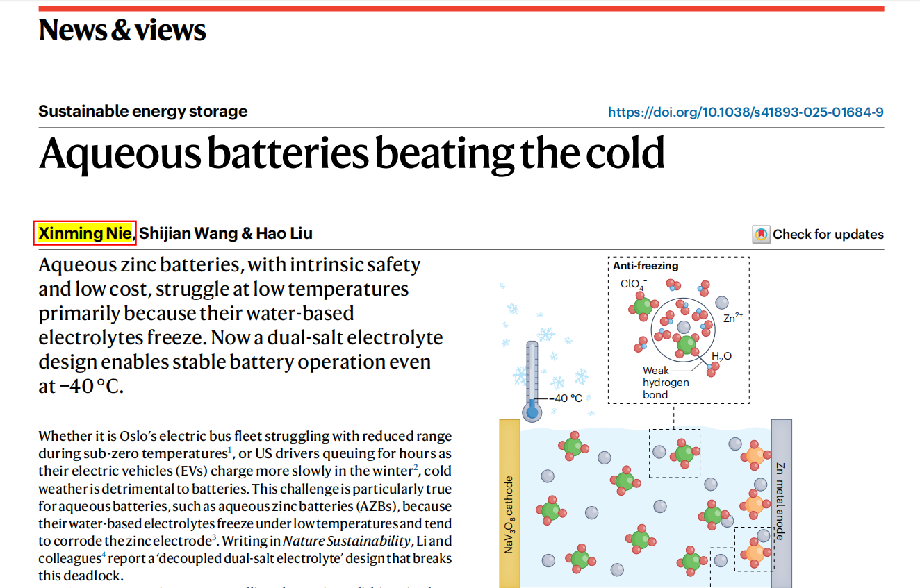 近日,物电学院聂新明老师在国际顶级环境科学与生态学领域期刊《Nature Sustainability》(SCI一区TOP,影响因子:27.1)发表题为"Aqueous batteries beating the cold"的文章。论文第一作者为我院聂新明老师,通讯作者为澳大利亚悉尼科技大学清洁能源技术中心王时建博士和刘浩教授。