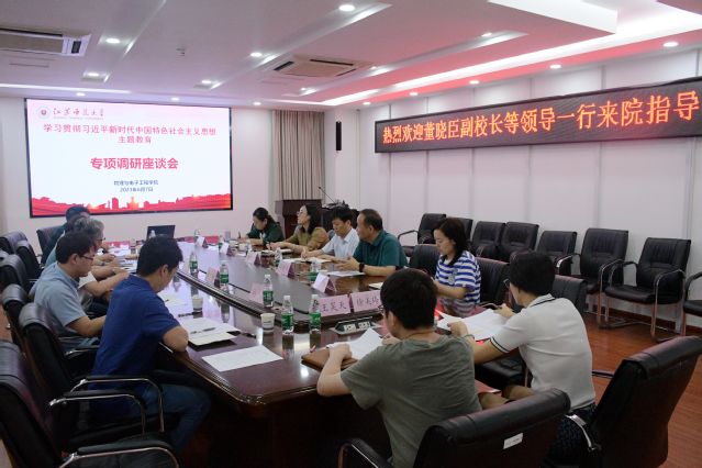 王夫寿书记首先代表学院党委汇报了主题教育开展情况。根据校党委统一部署,物电学院党委高度重视、精心组织,第一时间成立物电学院学习贯彻习近平新时代中国特色社会主义思想主题教育领导小组,制定印发主题教育实施方案和理论学习计划,严格按照工作计划推进理论学习和专题读书班活动。由班子成员牵头成立专题调研组,紧扣“三问三解”确定调研课题,深入一线调查研究,面向广大师生先后召开研究生管理、学生生活保障、学期期中师生座谈会、毕业生座谈会及标志性成果培育专题调研座谈会等主题教育专题调研,切实把调查研究成果转化为指导实践、推动工作、破解难题的实际成效。