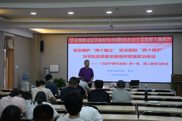 6月14日下午,物电学院举办学习贯彻习近平新时代中国特色社会主义思想主题教育6月份第一次专题读书班,学院全体党员参加会议,会议由院党委王夫寿书记主持。