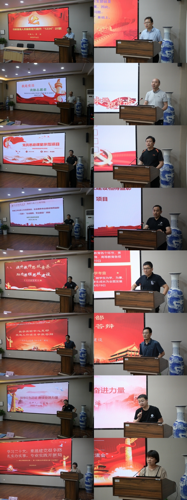 评审会上,行政管理支部、物理系支部、电子工程系支部、光学工程系支部、重点实验室支部、实验教学中心支部、本科生支部和研究生支部依次上台进行立项陈述,从可行性分析、主要内容、时间进度、预期成效及预算等方面对项目进行分析,项目选题既立足当前解决现实问题,又着眼长远打牢工作基础,整体质量较高。