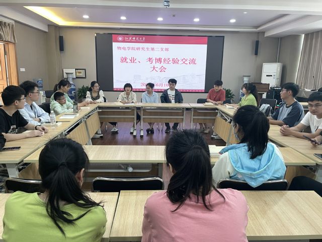物电学院研究生第二党支部于6月10日上午9:00在327会议室举办2023届毕业生党员考博、就业经验交流会。此次活动旨在帮助支部低年级党员深入了解当前的升学和就业形势,树立正确的学习观、就业观,科学规划学习和职业发展道路。