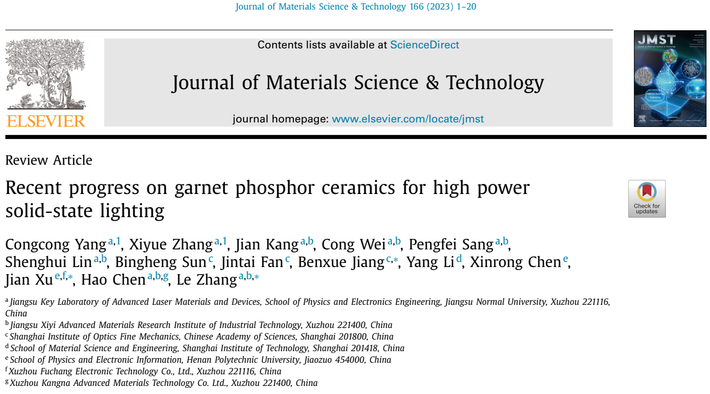 近期,物电学院陈浩教授、张乐教授课题组应邀在《Journal of Materials Science &Technology》期刊上发表了题为“Recent Progress on Garnet Phosphor Ceramics for High Power Solid-State Lighting”的长篇综述论文,详细报道了先进稀土光电功能材料团队近十年来在高功率固态照明用荧光陶瓷领域的研究进展。该综述论文由陈浩教授、张乐教授课题组为主进行组织撰写,并邀请了中国科学院上海光学精密机械研究所、河南理工大学、上海应用技术大学等多家单位参与撰稿。我院2020级光学专业硕士研究生杨聪聪和电子信息专业硕士研究生张曦月为共同第一作者,张乐教授、中国科学院上海光学精密机械研究所姜本学研究员、河南理工大学徐坚博士为共同通讯作者,上海应用技术大学李扬博士以及江苏锡沂高新材料产业技术研究院相关研究人员为论文发表做出了突出贡献。本项工作是我校执行国家重点研发计划“稀土新材料”重点专项的标志性成果。