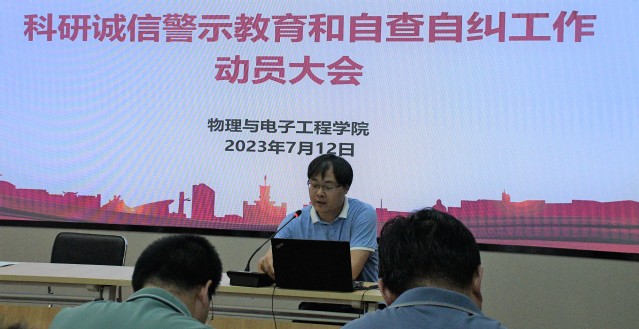 为落实学校关于加强科研诚信与作风学风建设的相关要求,大力弘扬新时代科学家精神,增强从事科学研究工作的师生科研诚信意识,规范科研行为,营造求真务实的学术氛围和科研环境。2023年7月12日下午,物电学院召开科研诚信警示教育和自查自纠工作动员会,会议由科研副院长张乐主持,物电学院全体教师参加了会议。