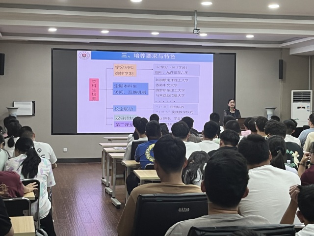 最后,韩老师介绍了实习实践基地,并列举本专业诸多杰出校友创业成功案例,激励同学们积极参加课外实践及竞赛项目来拓宽知识面,锻炼创新能力。