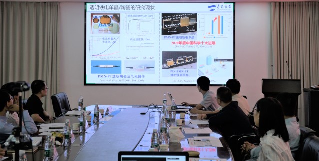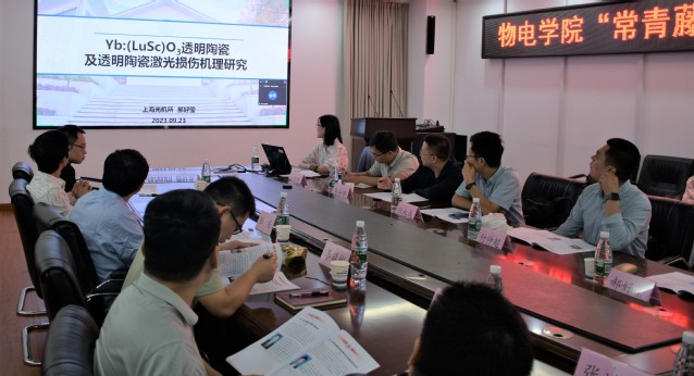 接下来,报告会开始,首先,四川大学齐建起教授作了题为“A2B2O7系透明陶瓷制备及性能研究”的报告。齐建起教授、博士生导师,四川大学辐射物理及技术教育部重点实验室副主任。报告中齐教授介绍了课题组的研究方向,主要是针对A2B2O7体系开展的体系设计、高性能样品制备和体系结构性能调控等方面工作,以及在这方面取得的重要成果。中国科学院上海光学精密机械研究所郝好莹博士作了题为“宽发射带的倍半氧化物激光陶瓷及透明陶瓷激光损伤机理研究”的报告。她介绍了针对Yb3+的特性,选用倍半氧化物制备的固溶体陶瓷做基质材料的优势,并分享了数据对比结果,她强调为了更加准确的分析损伤过程,她们自建了激光损伤测试平台可在线记录纳秒级动态损伤过程。青岛大学张永成教授作了题为“透明电光/压电陶瓷的制备及应用”的报告。张永成教授是青岛大学特聘教授、博士生导师、院长助理。他介绍了稀土元素掺杂改性Pb(Mg1/3Nb2/3)O3-PbTiO3(PMN-PT)透明陶瓷具有的优异性能,以及在相关领域应用前景;同时,他详细分享了高性能PMN-PT基透明电光/压电陶瓷的制备工艺和可应用性。南昌大学陈兴涛博士作了题为“类蓝宝石立方氧化铝透明陶瓷的冷高压合成和结构性能”的报告。陈兴涛是南昌大学光电信息材料及器件团队主要成员。他介绍了团队在功能性透明陶瓷材料的制备、性能表征和功能材料开发的研究工作,并分享了取得的研究成果。沈阳大学付仲超博士作了题为“氧化钇透明陶瓷的湿法成型制备及性能表征”的报告。付仲超博士后是江苏省省级稀土光功能陶瓷研发机构特聘专家。目前主要从事光功能透明陶瓷材料的设计、制备与性能调控研究。他介绍了氧化钇透明陶瓷具有的优点以及应用前景,以及在此领域开展详细工作和取得的成果。我院王俊副教授作了题为“倍半氧化物激光陶瓷的研制及其在固体激光器中的应用”的报告。王俊副教授主要从事倍半氧化物及钇铝石榴石体系激光陶瓷材料的研究。他介绍了以Y2O3、Lu2O为代表的倍半氧化物材料的特征和制备方法,并详细介绍了具体的参数和应用领域。我院周天元副教授作了题为“空间太阳光泵浦固体激光器用透明陶瓷研制”的报告。周天元副教授主要从事透明陶瓷材料制备及光学质量提升、陶瓷成型、缺陷态及陶瓷相关应用研究。他介绍了空间太阳光泵浦固体激光技术的重大意义,以及透明陶瓷作为新一代固体激光增益介质具有的优势和技术瓶颈问题,以及团队在此方向上取得的进展。
