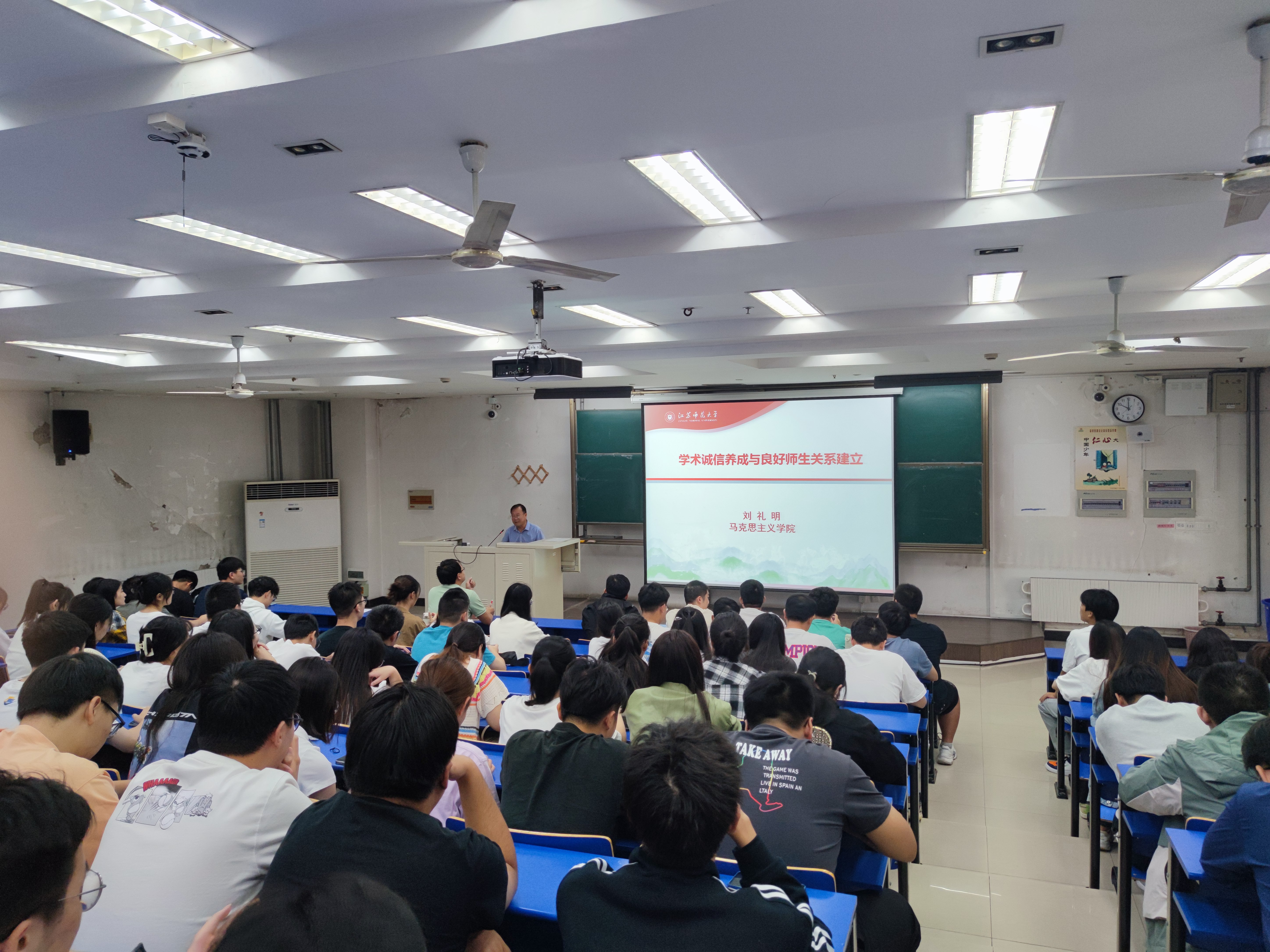 为增强2023级研究生科研诚信和学术规范意识,引导新生与导师建立良好的师生关系,9月22日上午10时,物电学院在8-J102教室开展专题教育,我校马克思主义学院刘礼明教授应邀开展题为“学术诚信养成与良好师生关系建立”的专题讲座。讲座由副院长张乐主持,全体研究生新生参加。