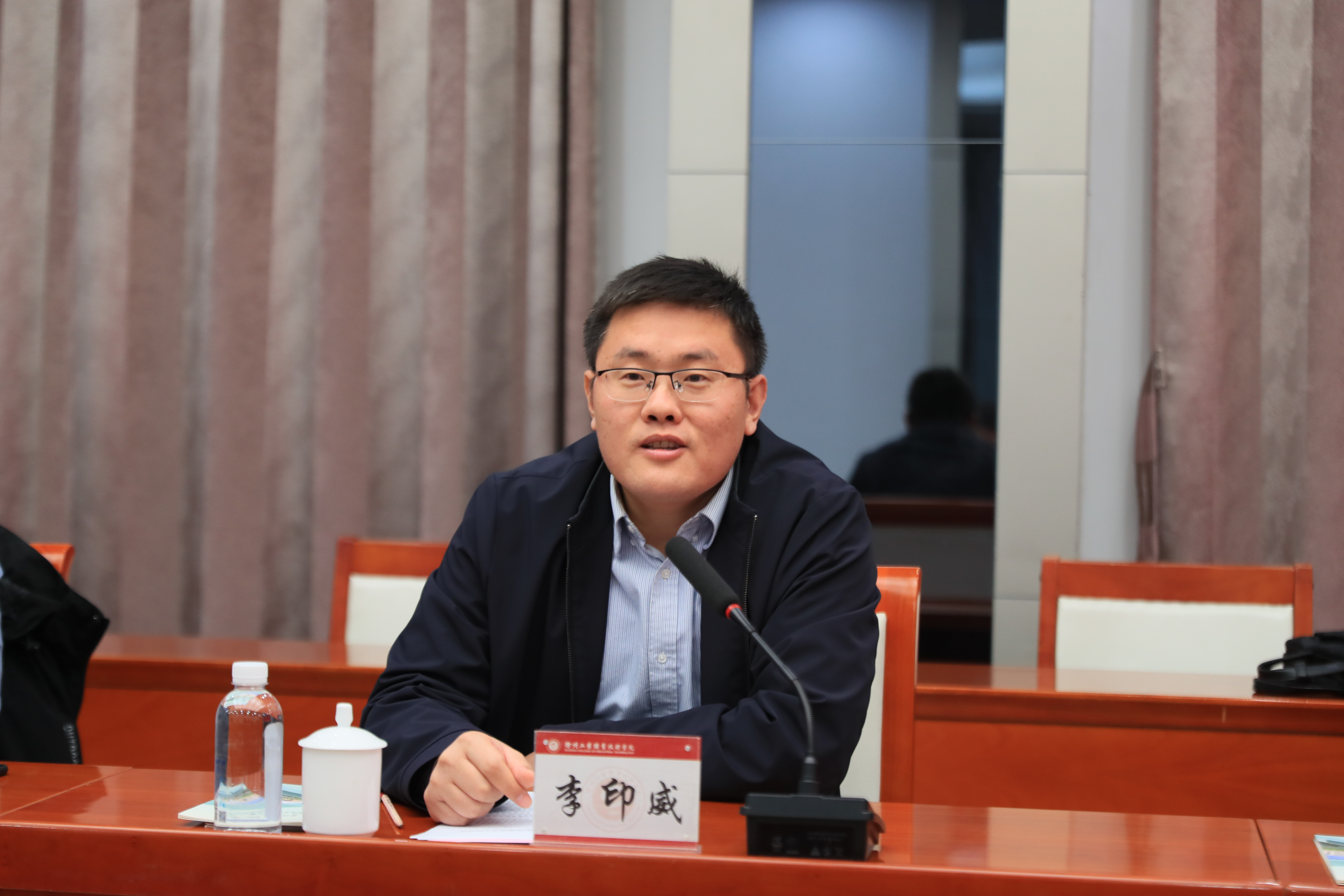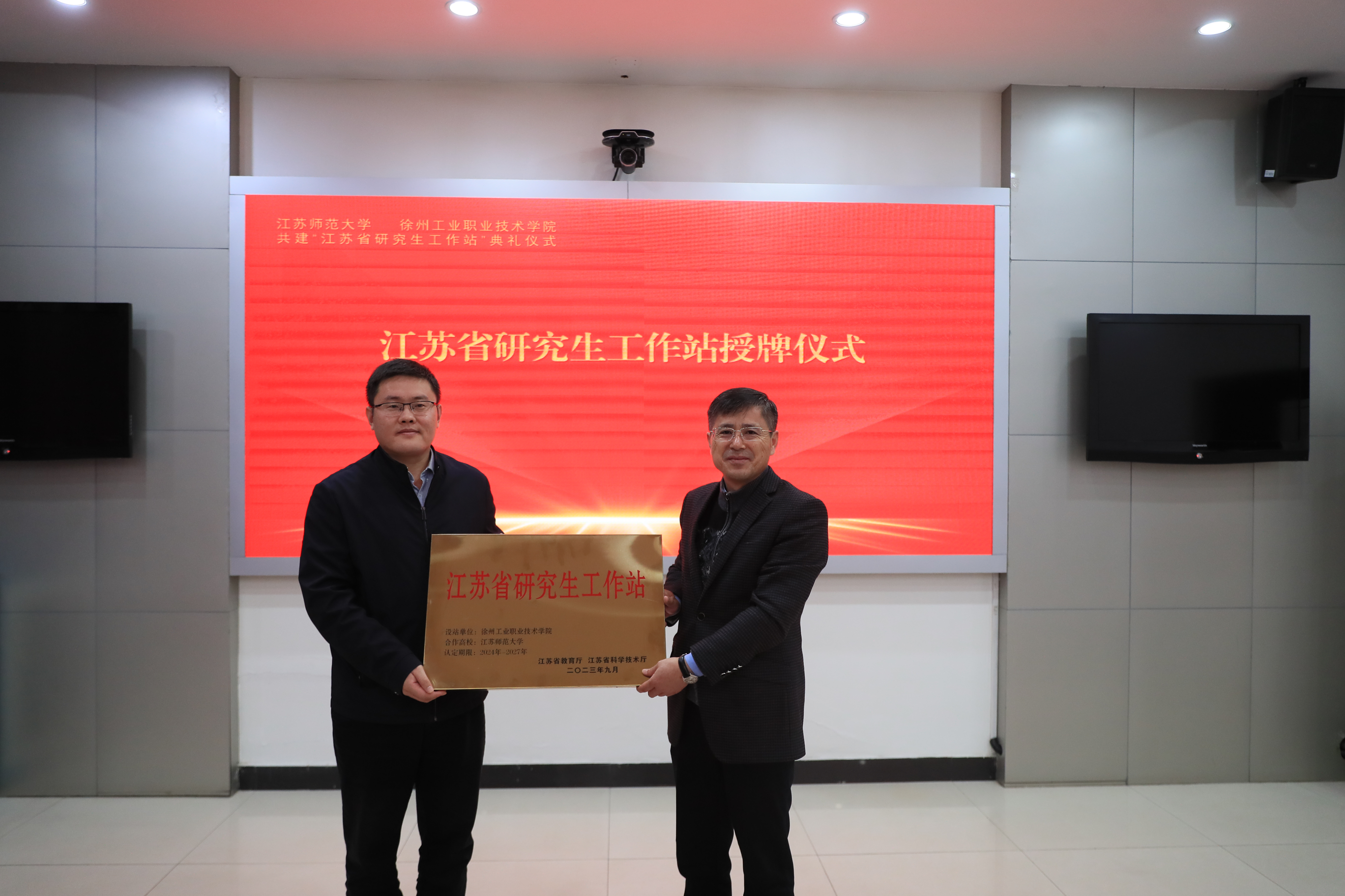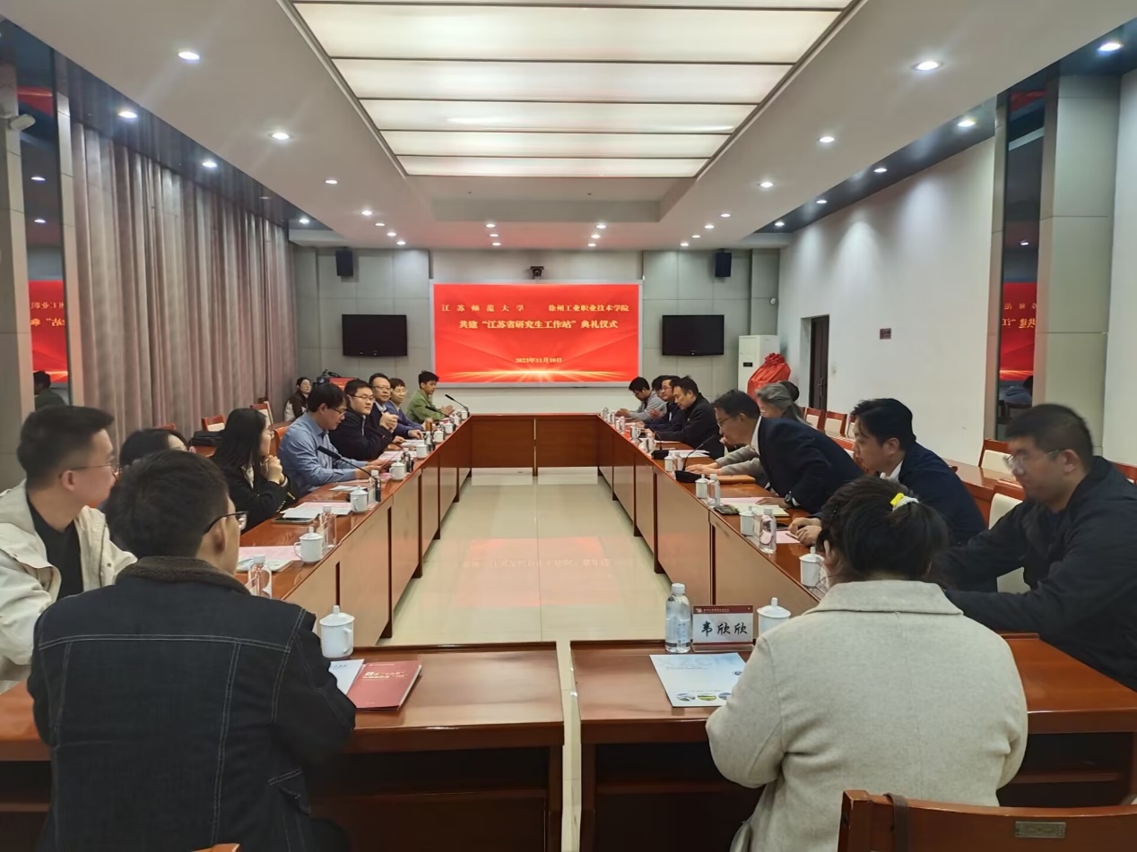 11月10日下午,物电学院院长李印威、研究生院副院长赵峻岩一行,赴徐州工业职业技术学院,举行由两校共建的江苏省研究生工作站揭牌仪式。仪式由张乐副院长主持,徐州工业职业技术学院副院长曾凡远携领导班子及教师代表参加。
