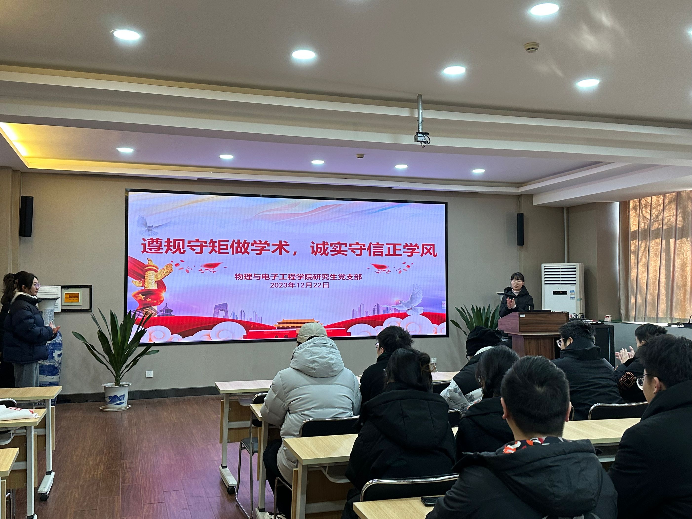 为增强研究生科学道德和学术诚信意识,12月22日上午,物电学院研究生党支部在7号楼327会议室举办了主题为“遵规守矩做学术,诚实守信正学风”的宣讲活动,校科学道德和学术诚信研究生宣讲团应邀做宣讲,物电学院80余名研究生参加了本次活动。