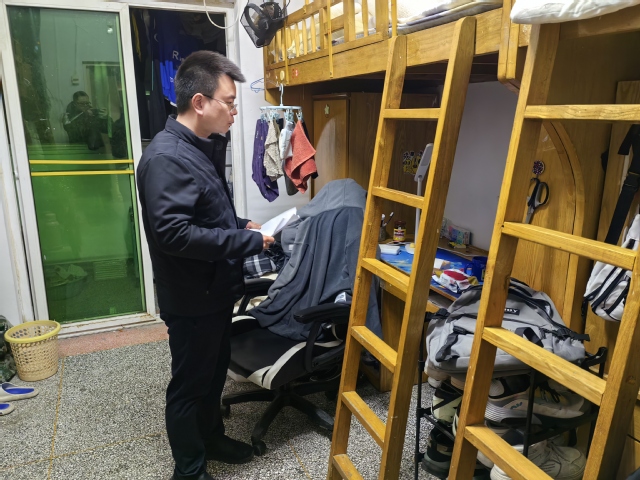 学院党委副书记赵明带领全体辅导员、班主任持续深入宿舍,逐一对用电、用水等安全事项及宿舍卫生进行全面检查,做到不漏一处,不留死角,确保参加人员全覆盖、全体学生全覆盖、所有宿舍全覆盖。走访中,各位老师着重强调了安全用电、建设平安宿舍的重要意义,坚决摒弃侥幸心理,并就学生返校思想状态、新学期学习计划及毕业生就业情况等与大家进行深入交流。