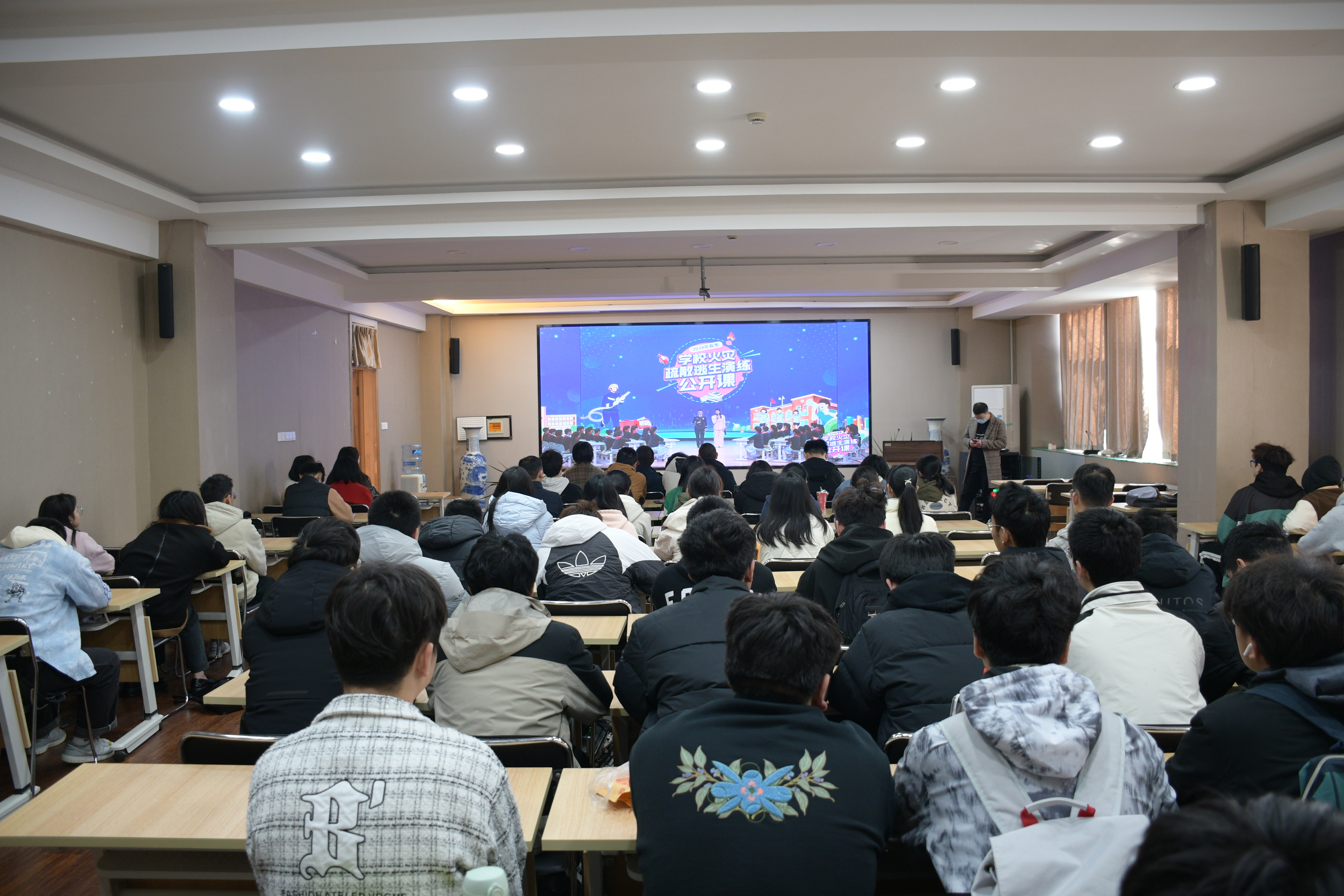 会上,学院邀请保卫处副处长巩岩结合近期高校发生的典型火灾案例,向参会师生详细讲解了火灾成因、危害和预防措施等消防常识,对极易发生火灾的工作场所和重点环节进行了重点提醒。随后,保卫处消防科科长赵远详细介绍了火场逃生自救注意事项。随着警报的响起,全体参演人员立刻进入应急状态,按照疏散路线和逃生技巧,安全撤离教学楼。