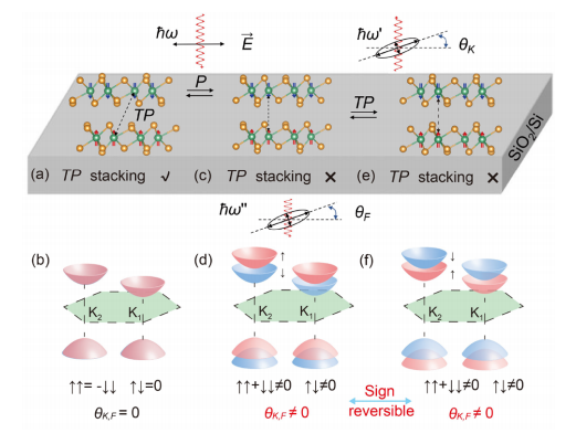 本研究工作基于多铁双层反铁磁Nb3I8与拓扑双层反铁磁MnBi2Te4,提出了一种新的磁光效应家族成员,即层控磁光效应,其起源于自旋与能谷的共同劈裂。研究发现通过层堆垛方式/磁化方向的演化,可以动态地调控双层Nb3I8的自旋劈裂/能谷劈裂,继而实现磁光信号动态开启与关闭。传统的TP堆垛(T是时间反演,P是空间反演)具有谷极化特性,但由于能带为自旋二度简并,TP对称的两套能带的光学跃迁将会相互抵消,导致磁光效应消失 (如图a-b)。相比之下,TP 破缺的层堆垛结构导致体系自旋与能谷同时劈裂。区别于交错磁体的自旋-动量锁定特征,层控反铁磁的能谱在整个布里渊区都可能出现自旋劈裂现象。这种独特的自旋极化特征联合强自旋轨道耦合效应可以诱导出不同自旋成分的能态发生光学跃迁(spin-flip带间跃迁),从而打破传统的自旋禁阻跃迁,引起非零的磁光效应(如图c-d)。层控磁光效应的典型特征是其符号由铁电极化方向与奈尔矢量方向共同控制(如图e-f)。此外,在传统的TP堆垛反铁磁中,通过施加相反方向的电场,也可以实现磁光效应符号的翻转。对于拓扑绝缘反铁磁MnBi2Te4,这种符号可逆的磁光效应甚至可以在低频极限下实现量子化,即量子磁光效应。本研究工作为磁光效应家族引入了层-自旋-谷-铁电等特性,使磁光效应这个古老的研究领域焕发了新的生机。