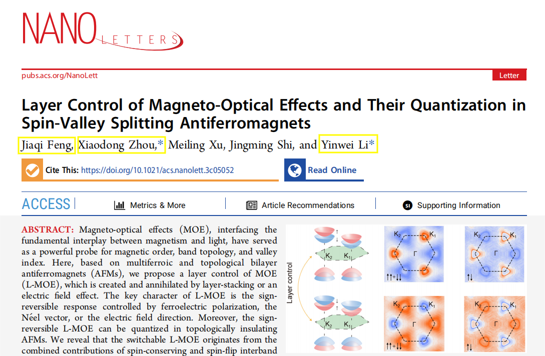 近日,物电学院青年教师周小东博士与李印威教授在反铁磁磁光效应的研究中取得重要进展,相关研究成果以“Layer Control of Magneto-Optical Effects and Their Quantization in Spin-Valley Splitting Antiferromagnets”为题,发表在国际知名期刊Nano Letters上。江苏师范大学为唯一署名单位,物电学院2022级硕士研究生冯嘉琪为论文的第一作者,周小东博士与李印威教授为通讯作者,徐美玲副教授与石景明教授为论文合作作者。该工作得到国家自然科学基金、江苏省自然科学基金等项目的支持。