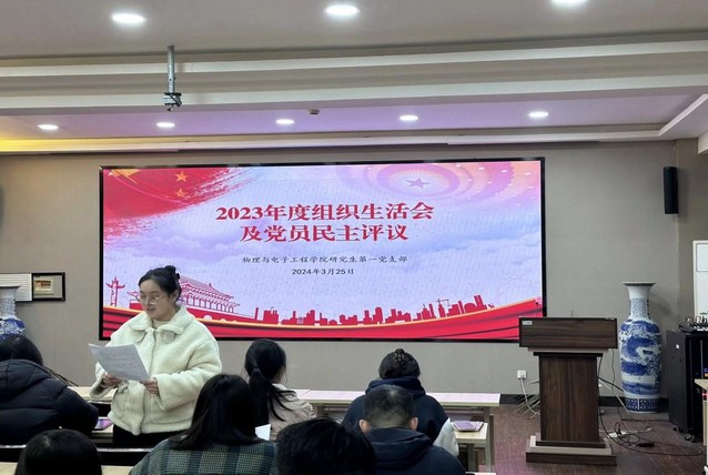 3月25日,物电学院研究生第一党支部在学院327会议室召开2023年度组织生活会并开展党员民主评议。支部全体党员参加会议,会议由支部书记周浩主持。