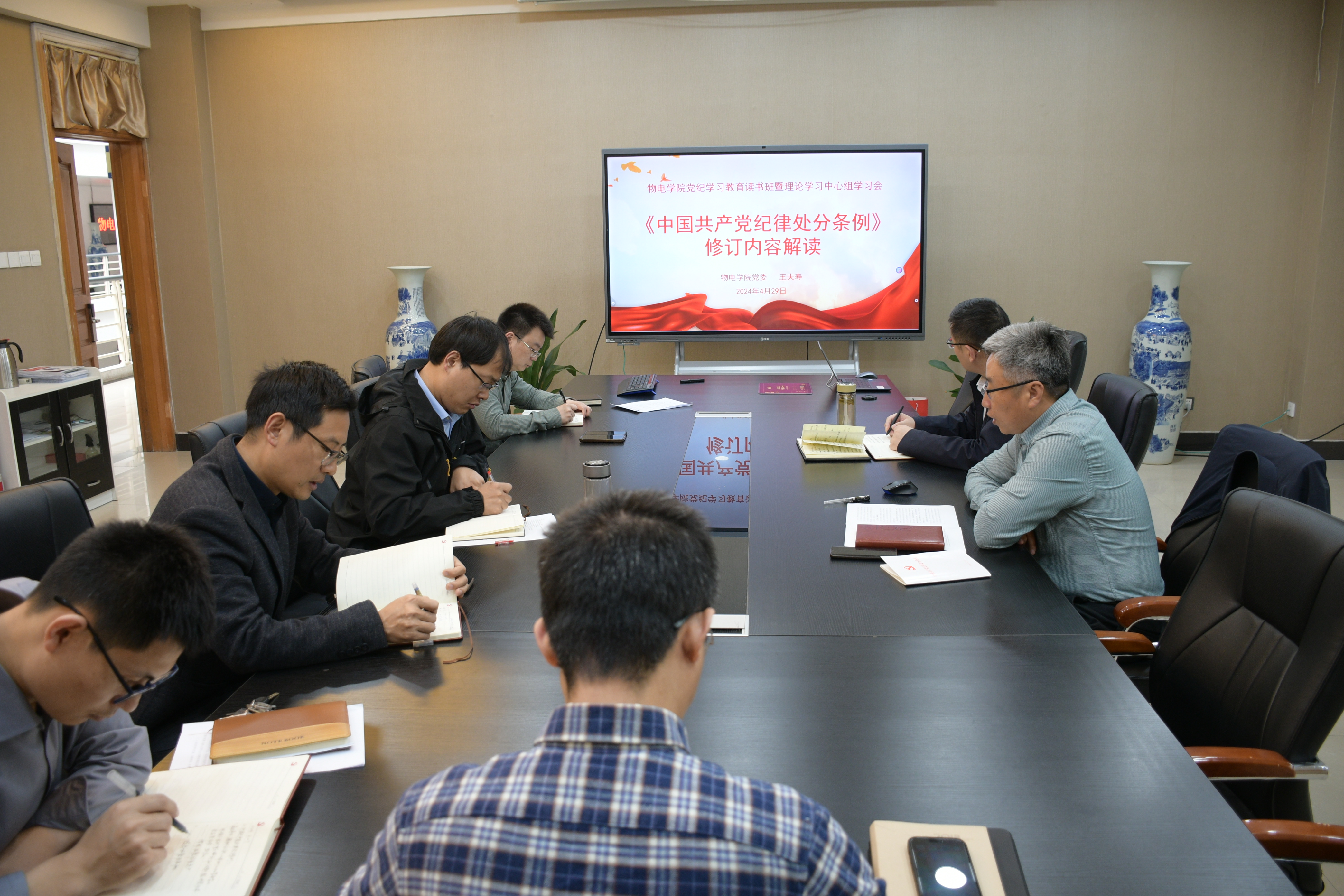 4月29日上午,物电学院党委举行党纪学习教育专题读书班暨理论学习中心组学习会。学院党委理论学习中心全体成员参加学习。会议由院党委书记王夫寿主持并主讲。