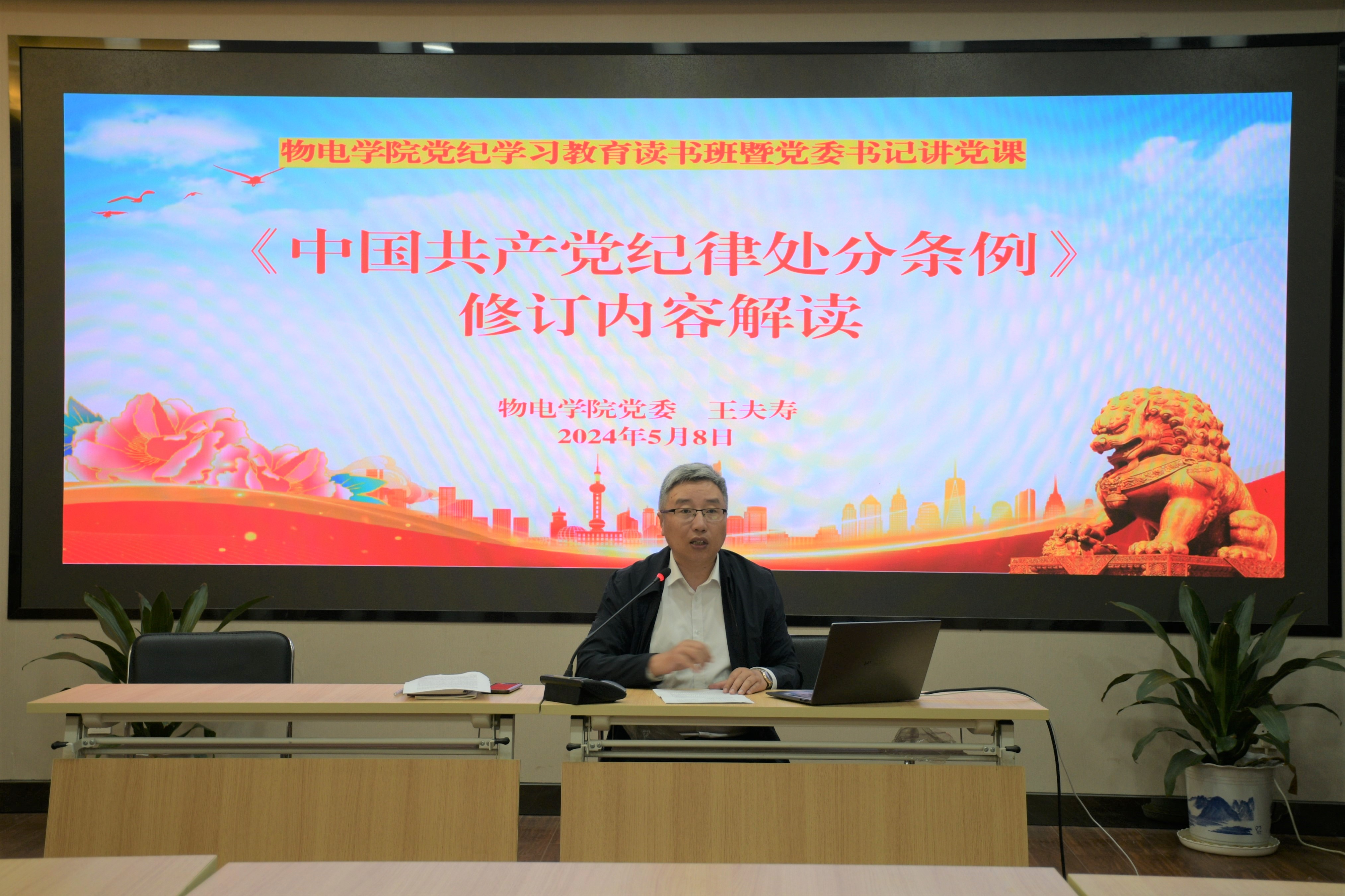5月8日下午,物电学院组织开展党纪学习教育专题读书班暨党委书记讲党课。学院全体党员参加本次专题学习,学院党委书记王夫寿主讲党课。