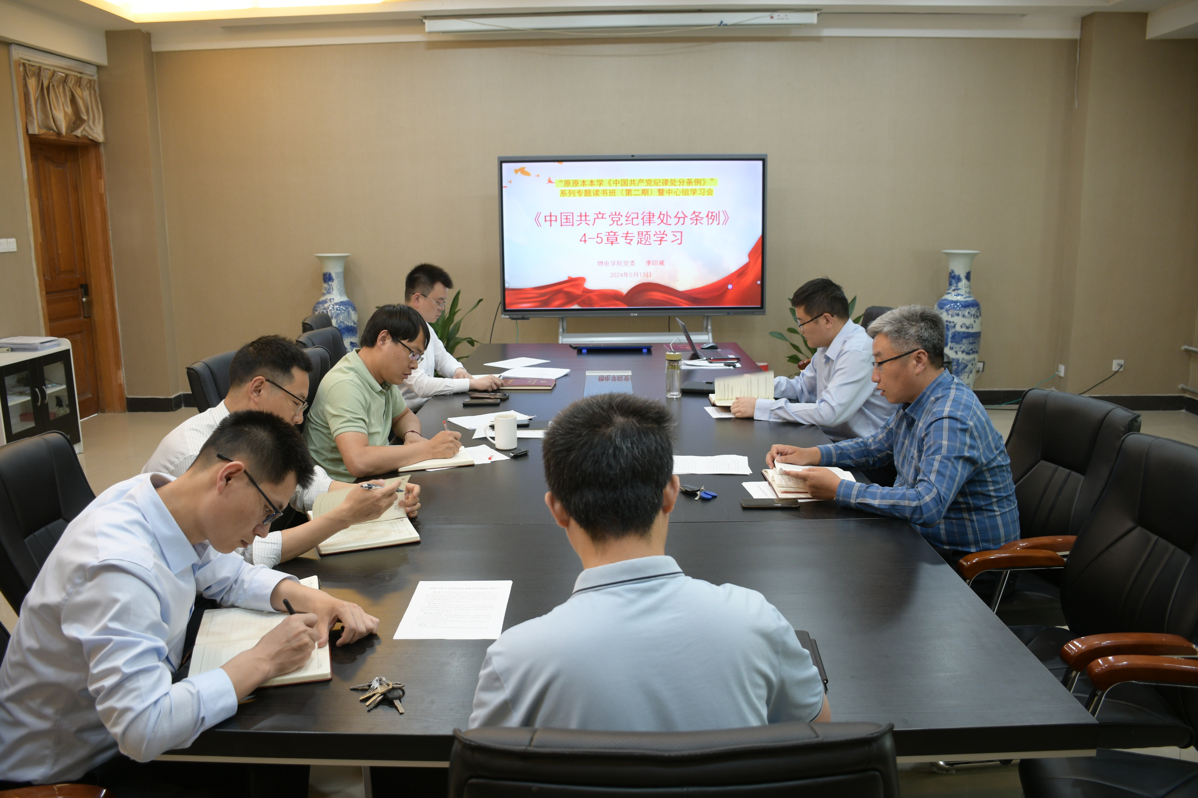 5月13日上午,物电学院党委理论学习中心组在学院325会议室开展“原原本本学《中国共产党纪律处分条例》”系列专题读书班(第二期)暨中心组5月份专题学习会。物电学院党委理论学习中心组成员参加学习。