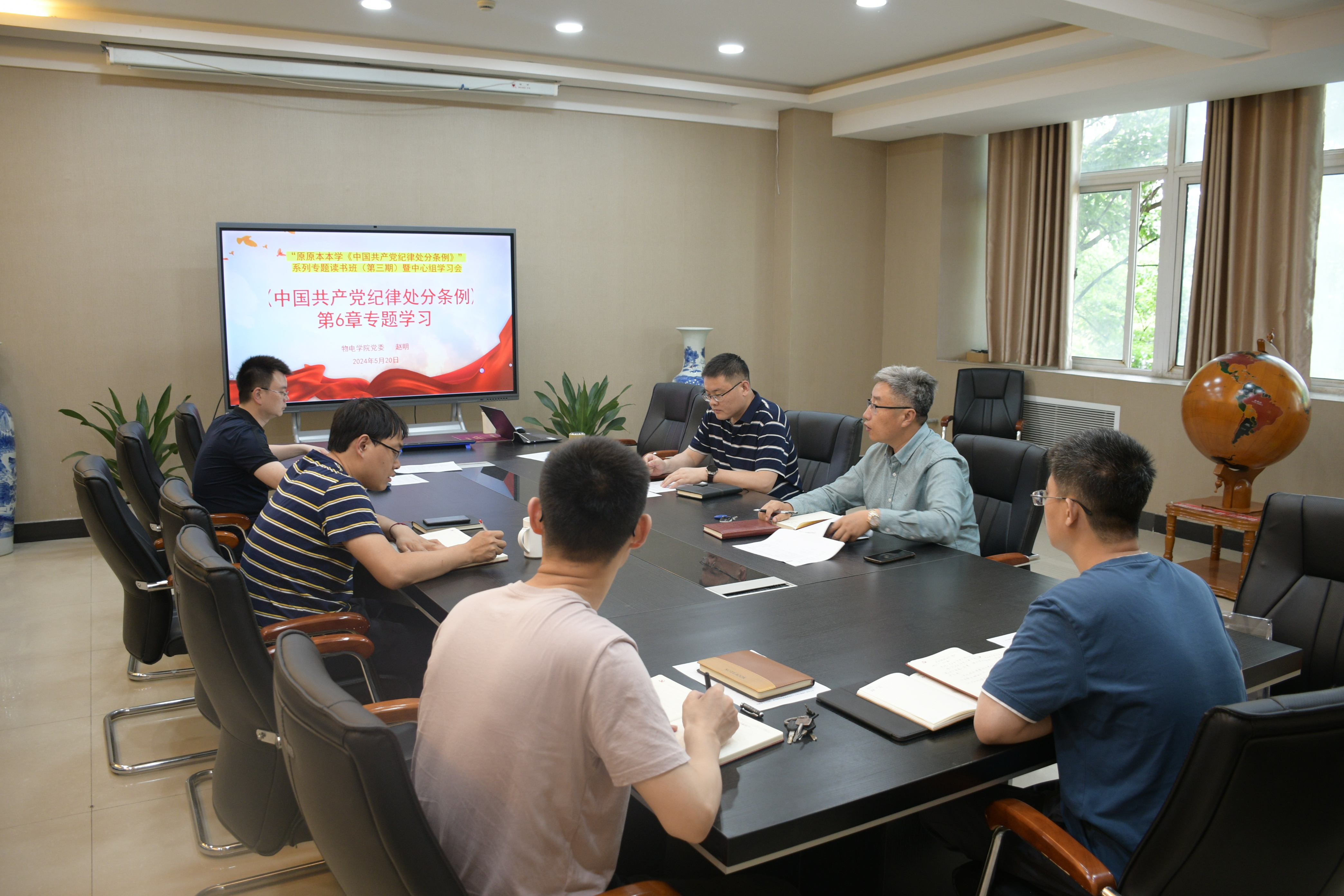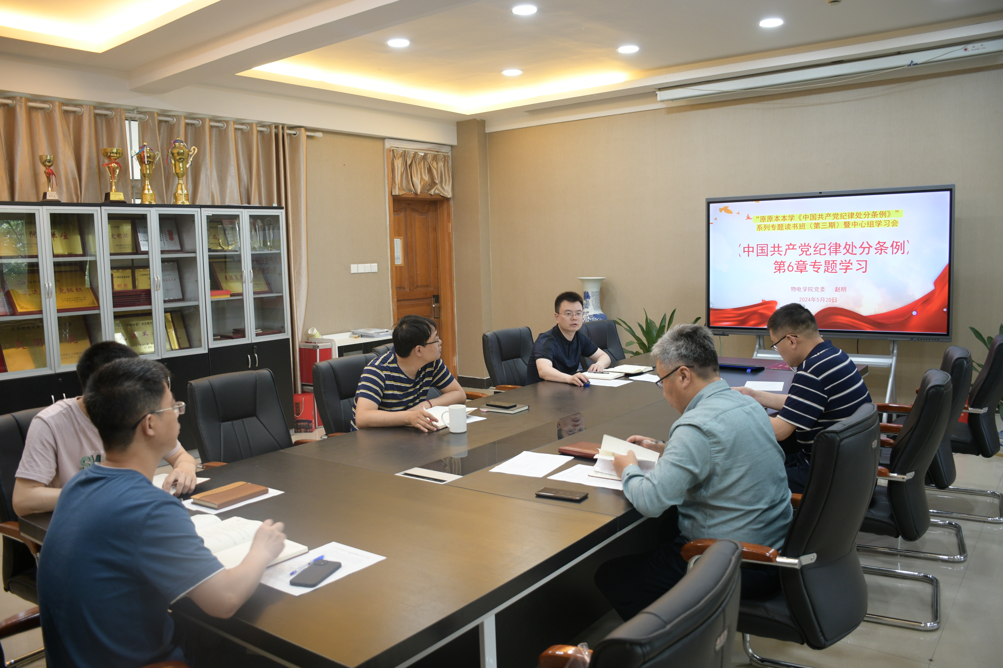 5月20日上午,物电学院党委开展“原原本本学《中国共产党纪律处分条例》”系列专题读书班(第三期)暨中心组学习会。学院党委理论学习中心全体成员参加学习。本次读书班由学院党委副书记赵明领学。