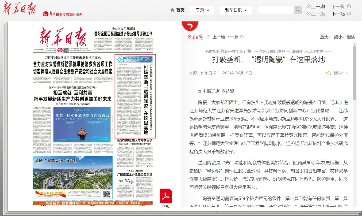 6月19日,新华日报头版报道了江苏省先进激光技术与新兴产业协同创新中心产业化基地——江苏锡沂高新材料产业技术研究院负责人、物电学院副院长张乐教授团队研发成果。