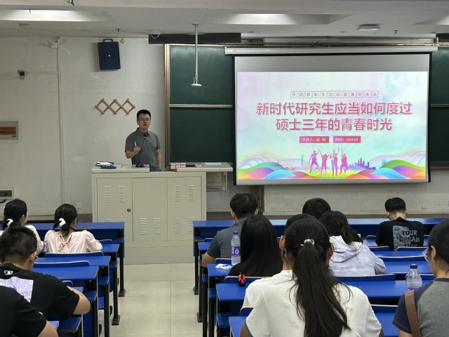 会上,赵明副书记作了题为“新时代研究生应当如何度过硕士三年的青春时光”的专题讲座。他紧扣主题,引导研究生积极树立个人发展目标,明确职业规划,以提问的形式和在座研究生互动,现场气氛热烈。紧接着,赵书记向在座研究生提出了三点期望。一是要弘扬“科创物电”精神,努力学习,刻苦钻研,心怀家国情怀,勇担科技报国的时代使命。二是要弘扬“运动物电”精神,希望大家在开展科研实验的同时保持良好的作息,加强体育锻炼,强健体魄。三是要努力提高自己的综合素质,学好专业知识的同时丰富自己的人文素养,保持良好的心态,获得成长,收获幸福。最后,他强调对待科研要抱有敬畏之心,秉持科研诚信和学术道德,坚决不越学术不端红线。
