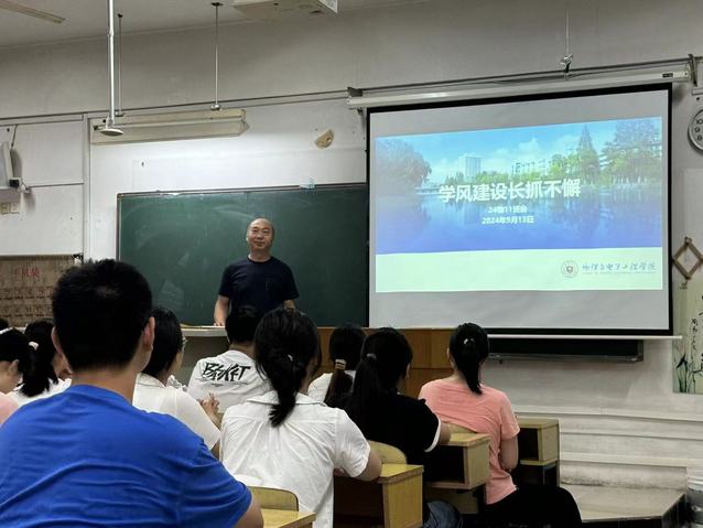 9月11日,物电学院召开2024年学风建设推进会。院党委副书记赵明详细布置了新学期学风建设具体安排,重点对近期加强课堂纪律和学生行为规范要求做出明确要求,号召全体辅导员、班主任和班干部要充分认识到教学评估及学风建设的重要性,以聚焦学风、班风建设进一步提升工作成效,严格督促各项工作要求落细落实。
