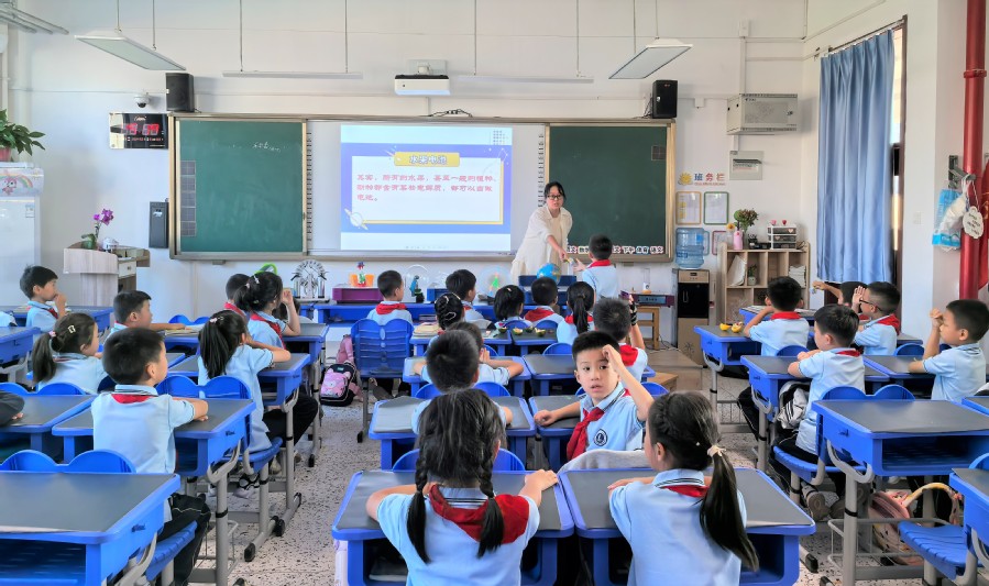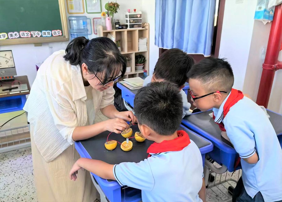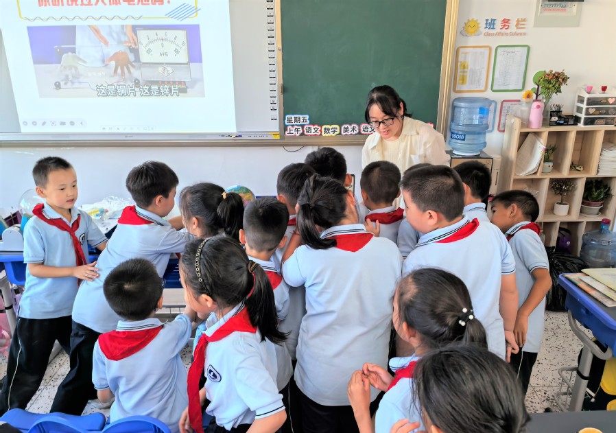 活动为期一下午,主要为二年级科学志愿者专场。活动开始,我们的程老师化身为“物理能手”,用简单的食材制作的水果电池,得到了孩子们的喜爱,老师通过生动的引入、有趣的实验、深度的互动,为同学们送上了一节内容丰富、别开生面的“科普盛宴”。颜老师还带着孩子们亲自操作各种物理实验演示装置,在实践和体验中,他们感受到物理现象的奇妙,增强了对物理世界的求知欲和探索欲。活动还设置了有奖问答环节。
