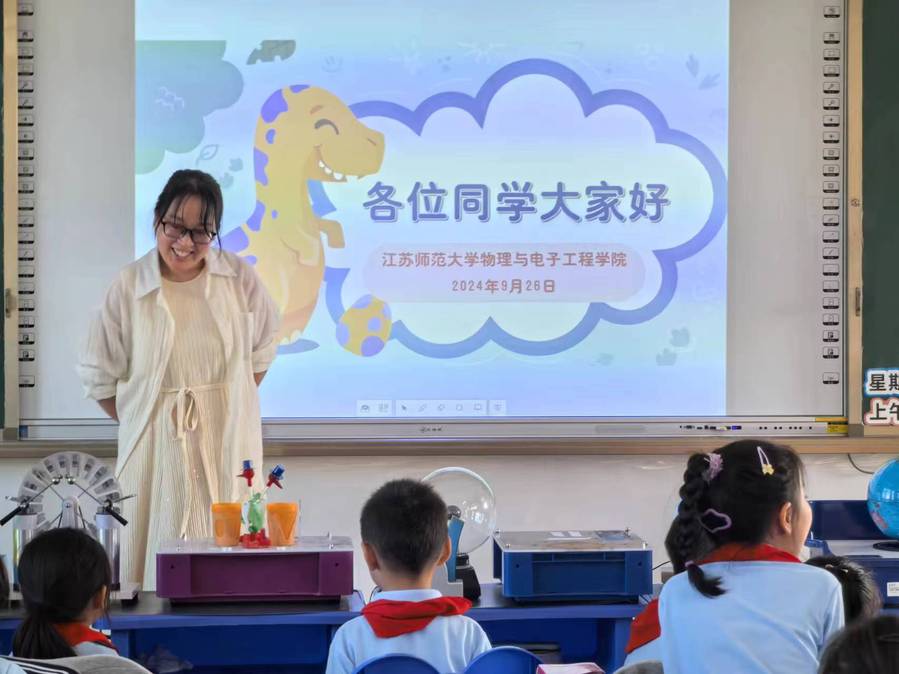 为了激发小学生对物理的兴趣与好奇心,培养学生科学素养,弘扬科学家精神,2024年9月26日下午,江苏师范大学物理与电子工程学院在附属中学二年级的教室开展了趣味科学大课堂活动。为小学生们呈现了一场精彩有趣的物理启蒙课,使孩子们了解更多物理知识,将科学的种子带到了学校的每一个角落。