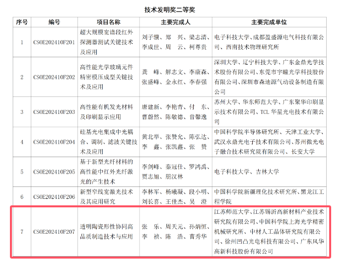 10月21日,第十届“中国光学工程学会科技创新奖”评选结果揭晓,张乐教授团队申报的“透明陶瓷形性协同高品质制造技术与应用”研究成果通过多轮严格评审,荣获“中国光学工程学会科技创新奖”技术发明奖二等奖。