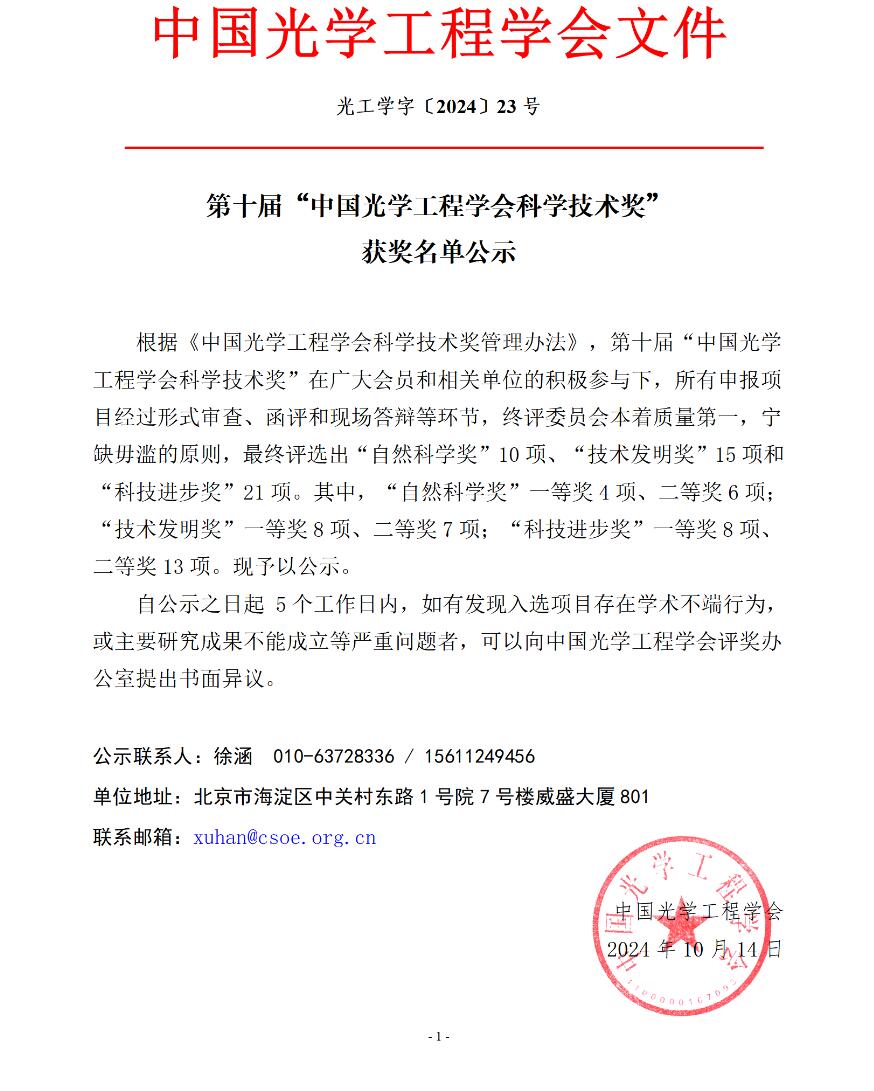 中国光学工程学会科技创新奖是经国家科学技术奖励工作办公室批准设立的奖项,旨在奖励在光学工程领域科学研究、技术创新与开发、科技成果推广应用和实现产业化方面取得卓著成绩或者做出突出贡献的个人和集体。此次学会共评选出“自然科学奖”10项、“技术发明奖”15项和“科技进步奖”21项。其中,“自然科学奖”一等奖4项、二等奖6项;“技术发明奖”一等奖8项、二等奖7项;“科技进步奖”一等奖8项、二等奖13项。