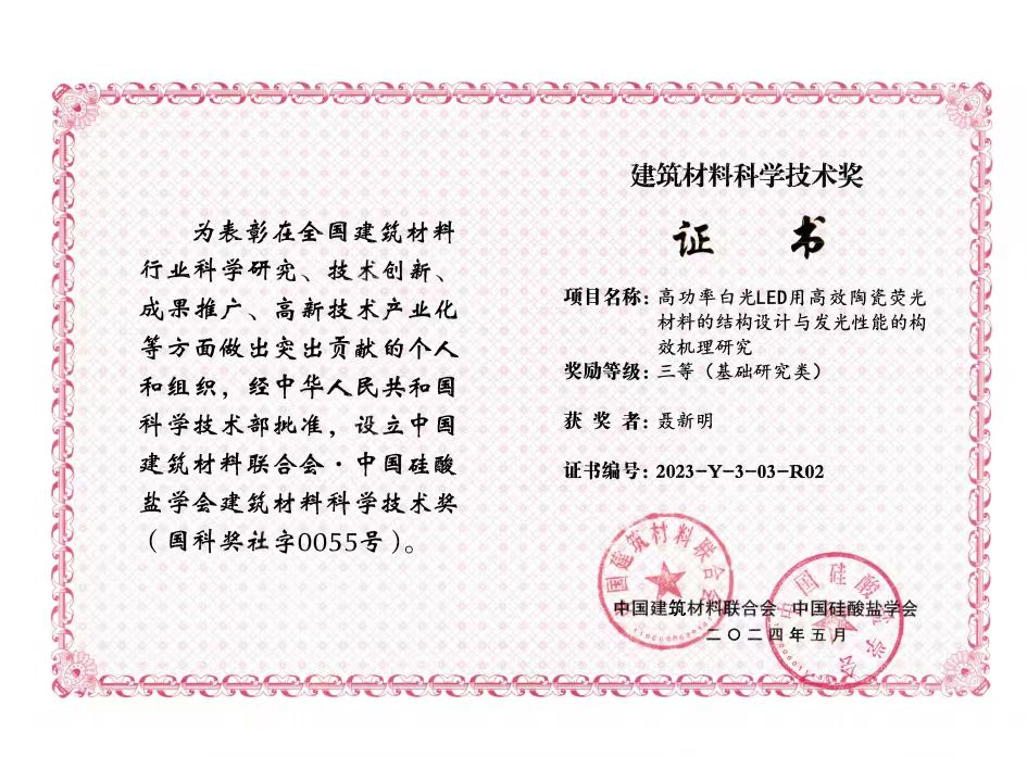 此外,6月26日,2023年度建筑材料科学技术奖获奖项目正式公布,我院聂新明老师申报的“高功率白光LED用高效陶瓷荧光材料的结构设计与发光性能的构效机理研究”获得建筑材料科学技术奖三等奖。