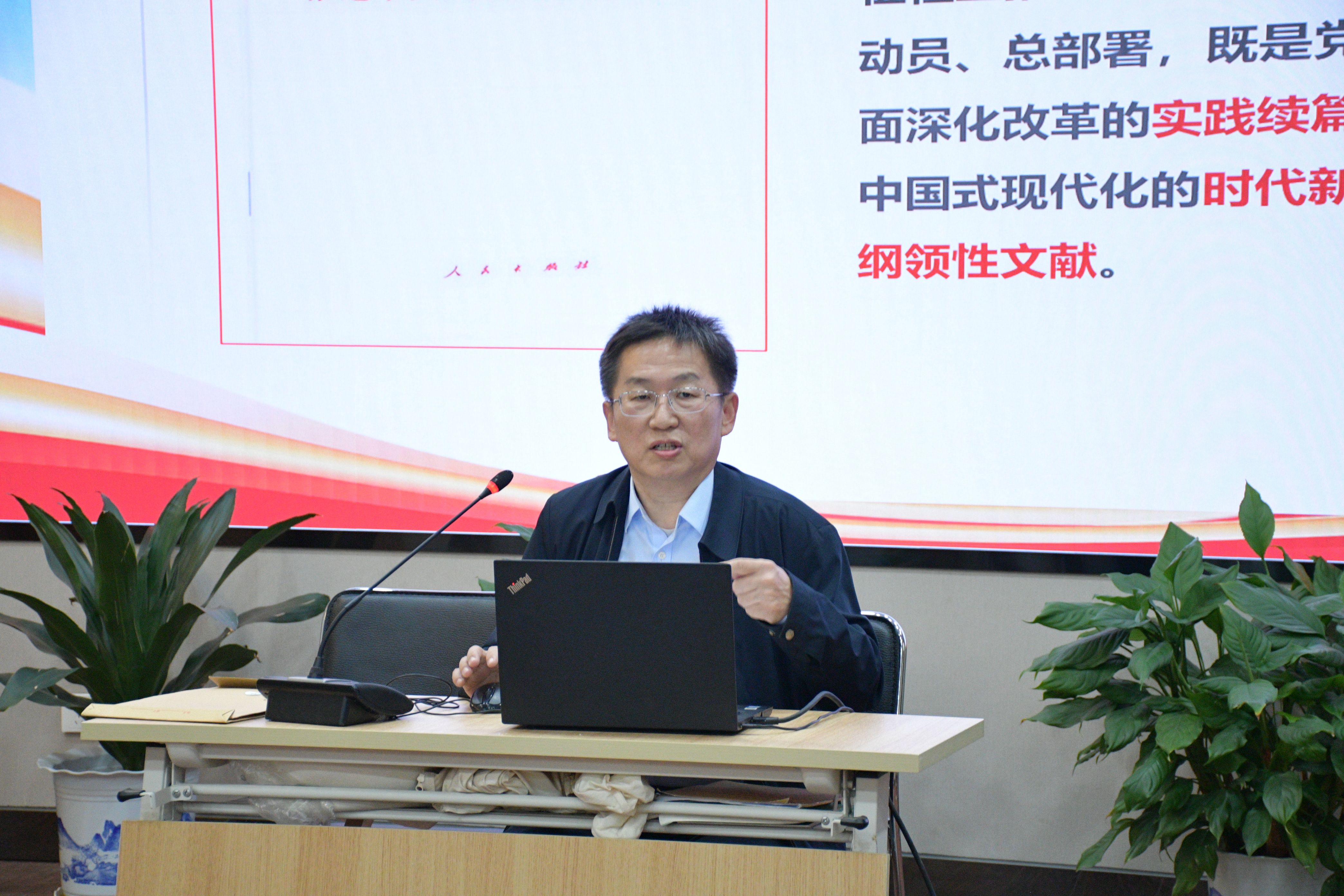 王丰书记分别从“党的二十届三中全会的主题和新时代全面深化改革的重大成就”“进一步全面深化改革、推进中国式现代化的重大意义和总体要求”“进一步全面深化改革做出的系统部署”“提高党对进一步全面深化改革、推进中国式现代化的领导水平”四个方面对全会精神进行了全面深入的阐述。王丰书记指出,党的二十届三中全会紧紧围绕着“进一步全面深化改革、推进中国式现代化”这一重大主题,是基于新时期新征程党和国家的“四个迫切需要”,是以实践经验和现实需要为出发点的,此次会议在以中国式现代化全面推进强国建设、民族复兴伟业的关键时期具有重大意义,全会审议通过的《中共中央关于进一步全面深化改革、推进中国式现代化的决定》在全面深化改革的进程中具有行动指南和路线图的重大意义。围绕国家、社会、人民等多个层面对于改革的必然要求,王丰书记强调进一步全面深化改革的重要性和必要性,指出全党必须自觉把改革放在更加突出位置,紧紧围绕推进中国式现代化进一步全面深化改革。