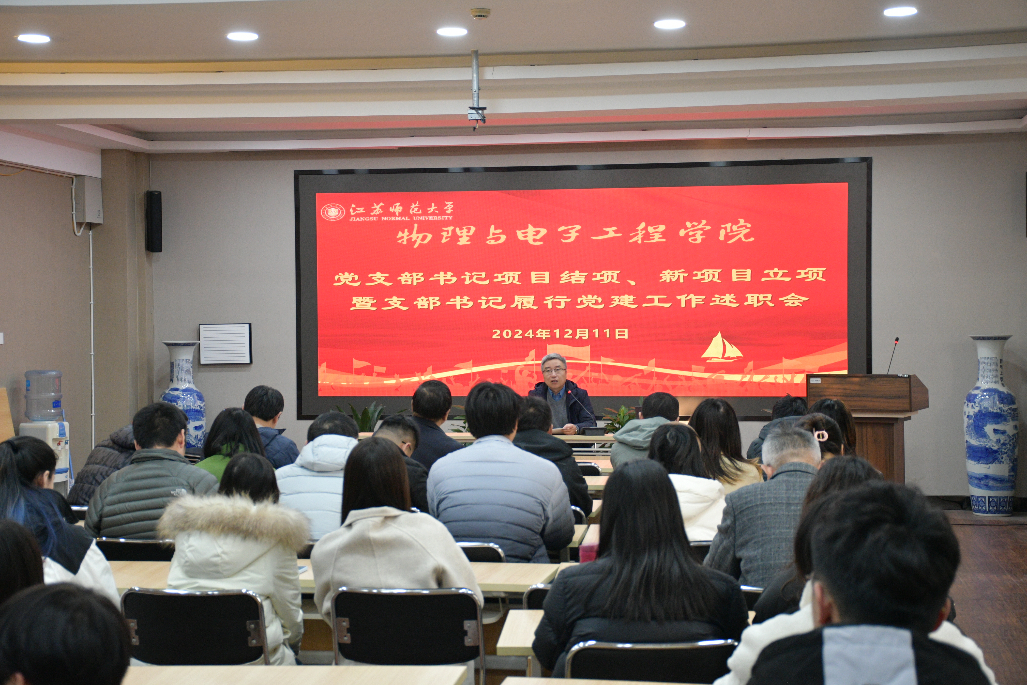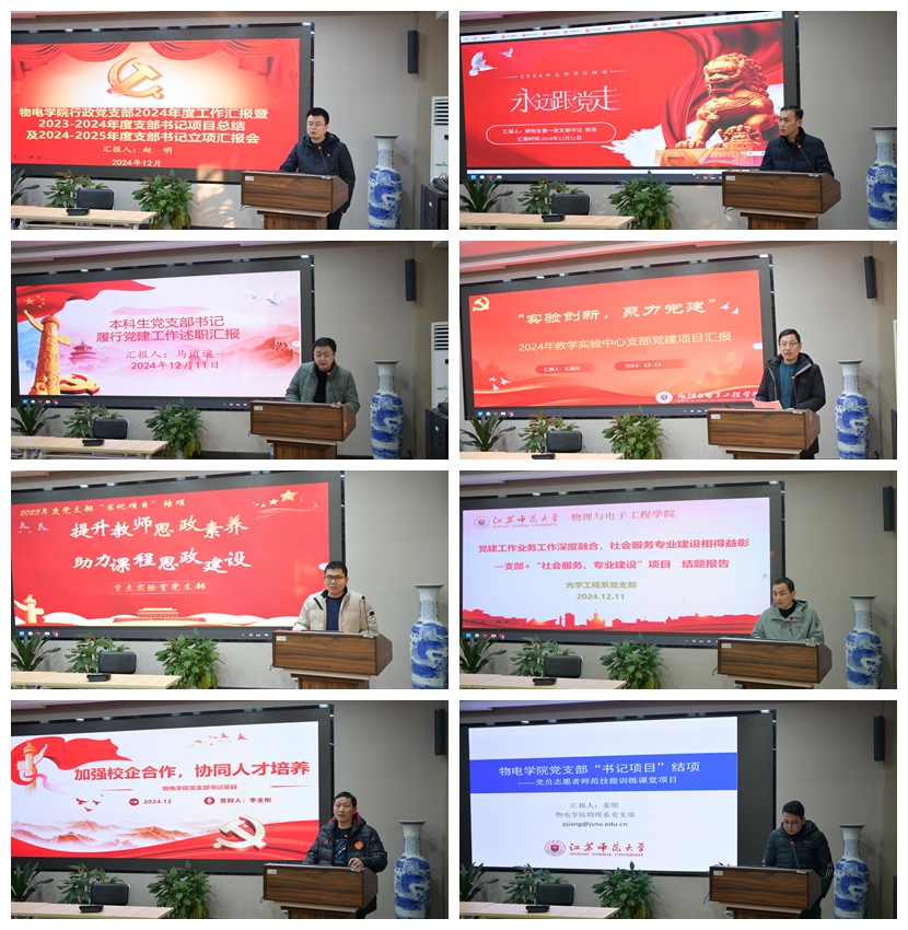 会议伊始,学院行政管理党支部、研究生党支部、本科生党支部、实验教学中心党支部、重点实验室党支部、光学工程系党支部、电子工程系党支部以及物理系党支部等各支部书记依次上台,就本年度党建工作履职情况进行述职。各支部书记详细回顾并总结了2024年本支部在加强党员思想建设、深化理论学习、严格党内组织生活以及围绕中心工作策划特色活动等方面的实践与成果,同时也对支部存在问题及未来整改措施等方面进行了汇报。